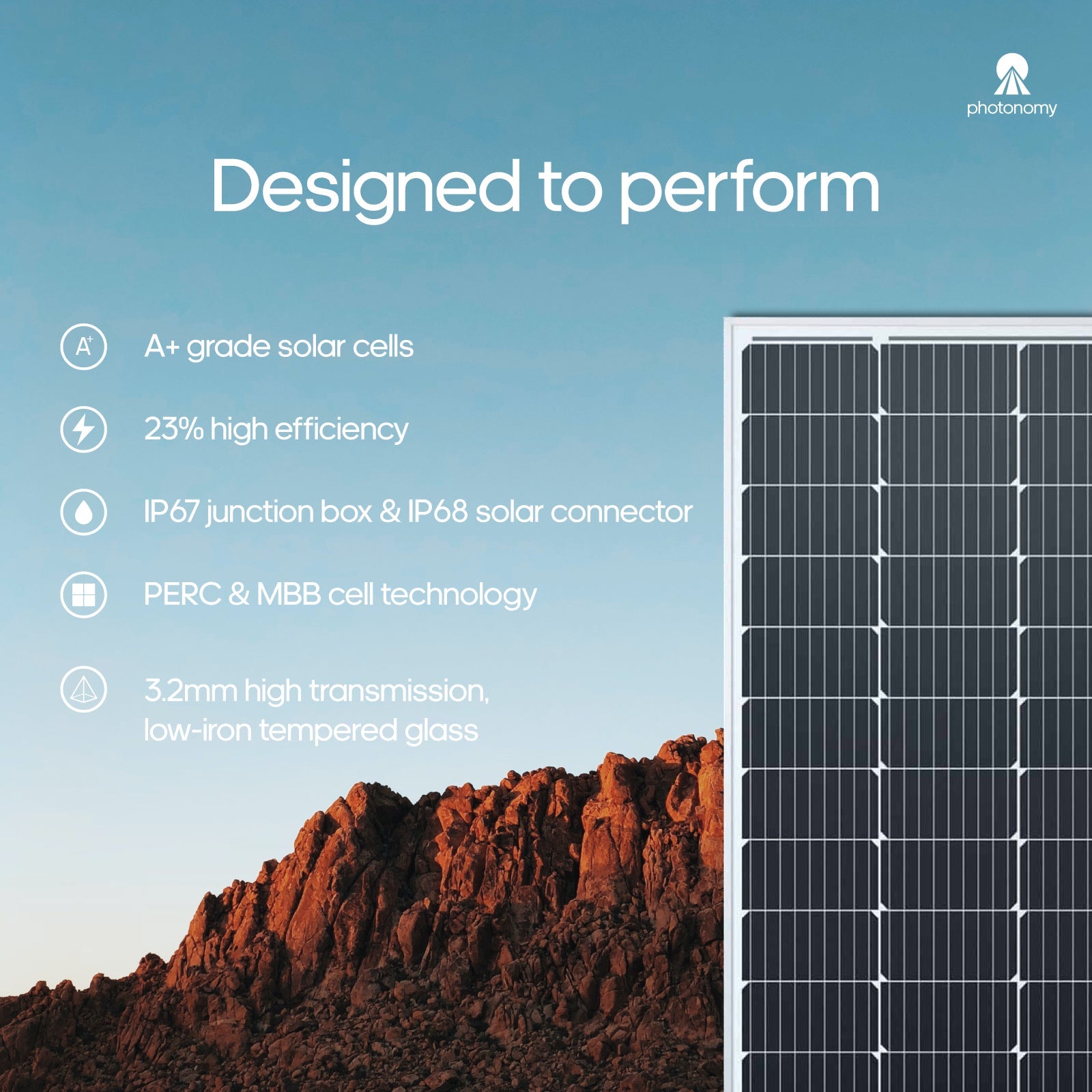 A+ grade monocrystalline half cut cells deliver industry-leading 23% conversion efficiency. Equipped with PERC technology, 12 busbars (MBB), Half Cut cells and advanced cell texturing to maximise convertible sunlight.